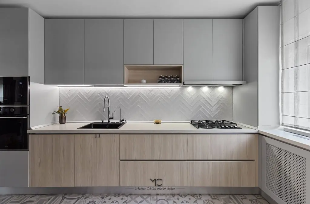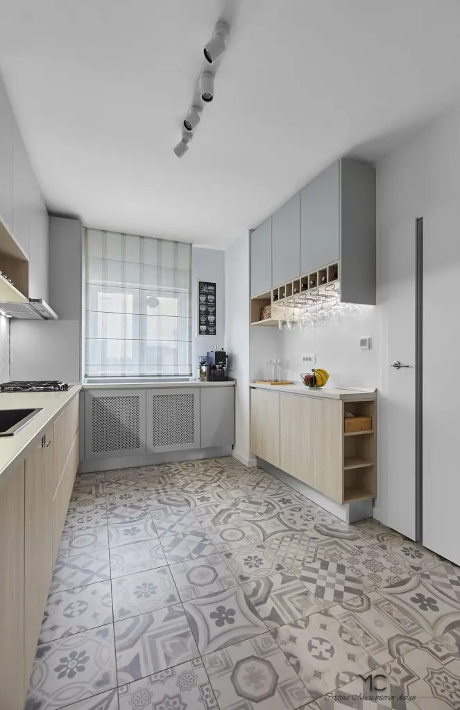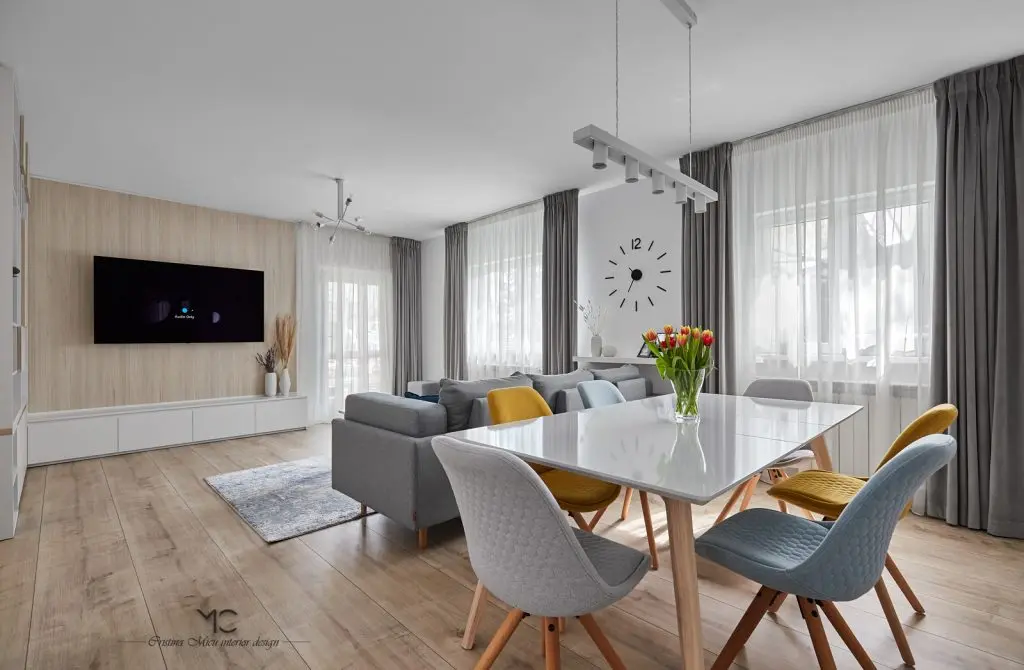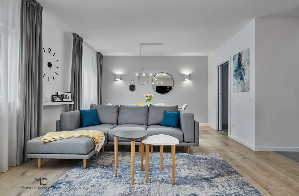 La nivel de compartimentare, a fost o singura interventie, la peretele comun dintre bucatarie si living. A fost propusa o usa glisanta care sa asigure un flux de circulatie mai usor si sa largeasca vizual spatiul. Pentru a integra acea usa glisanta, a fost nevoie de daramarea si reconstructia peretelui de rigips.