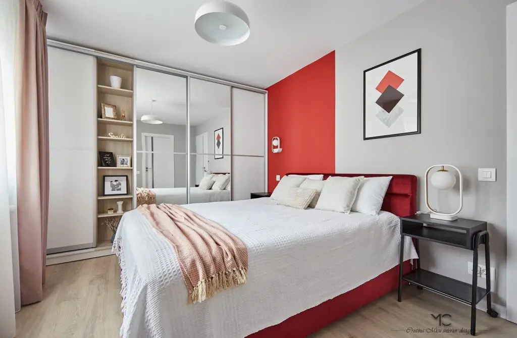 “ Dormitorul matrimonials-a configurat in vechiul dormitor de oaspeti. Acesta se impune prin peretele de accent rosu completat de patul rosu burgund, insa ambele temperate de gri-ul peretilor si restul elementelor albe. Oglinda dressingului ofera un impact vizual de marire al dormitorului. “