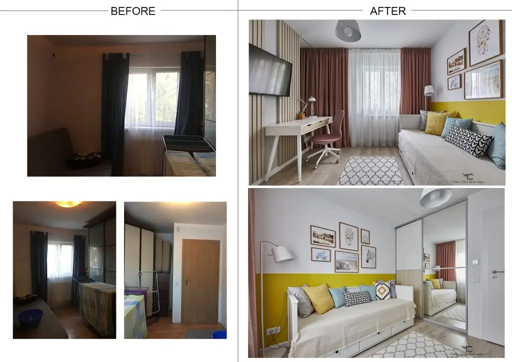 Clientii si-au dorit o reorganizare a spatiilor si a functiunii camerelor pentru a profita la maxim de spatiul disponibil si a asigura confortul mult visat. Vechiul dormitor matrimonial a devenit dormitorul de copil iar vechiul dormitor de oaspeti este acum dormitorul matrimonial.