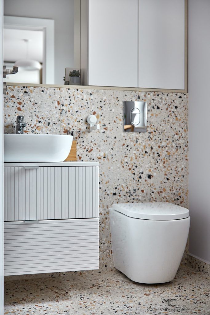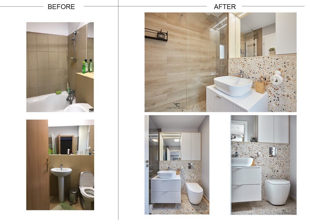 In baia matrimoniala arhitectii au propus un “dus walk in in locul vechii cazi, iar la nivel de finisaje s-a folosit preponderent terrazzo, completat de placi ceramice ce imita lemnul, amplasate acolo unde zonele sunt expuse apei. Pentru eficientizarea bugetului, pe restul peretilor s-a folosit vopsea lavabila gri potrivita pentru spatii umede.”