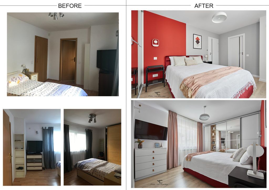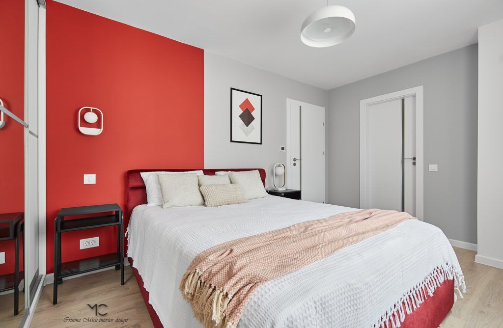 “ Dormitorul matrimonials-a configurat in vechiul dormitor de oaspeti. Acesta se impune prin peretele de accent rosu completat de patul rosu burgund, insa ambele temperate de gri-ul peretilor si restul elementelor albe. Oglinda dressingului ofera un impact vizual de marire al dormitorului. “