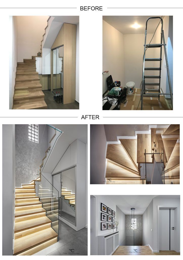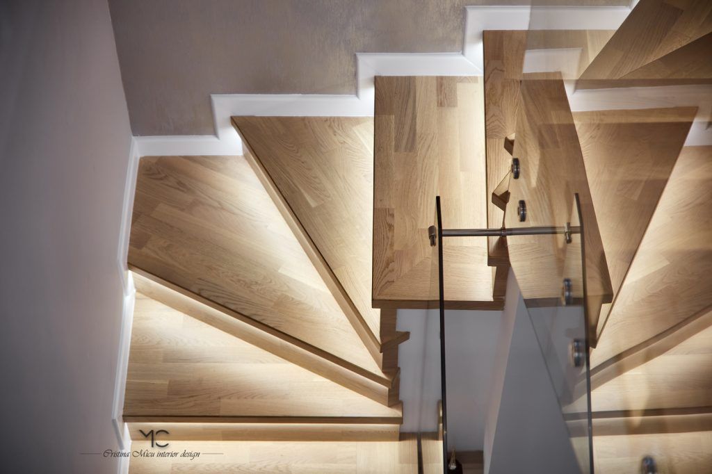 Din amenajarea initiala s-au pastrat parchetul si finisajul treptelor , la care s-a adaugat o lumina de accent (benzi de led cu senzor). In rest, au fost inlocuite toate finisajele, iar la parter a fost introdusa si incalzirea in pardoseala.