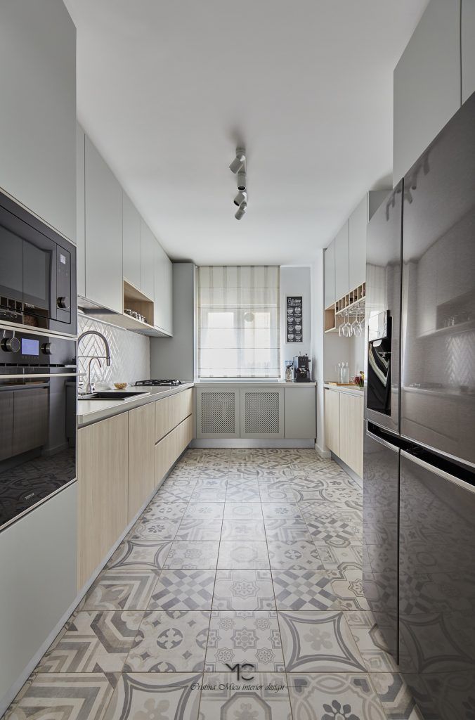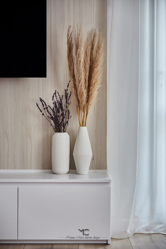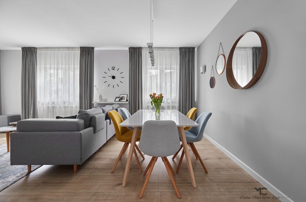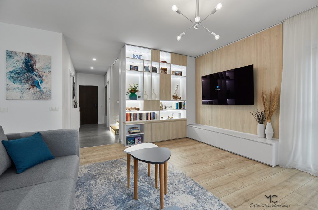 La nivel de compartimentare, a fost o singura interventie, la peretele comun dintre bucatarie si living. A fost propusa o usa glisanta care sa asigure un flux de circulatie mai usor si sa largeasca vizual spatiul. Pentru a integra acea usa glisanta, a fost nevoie de daramarea si reconstructia peretelui de rigips.