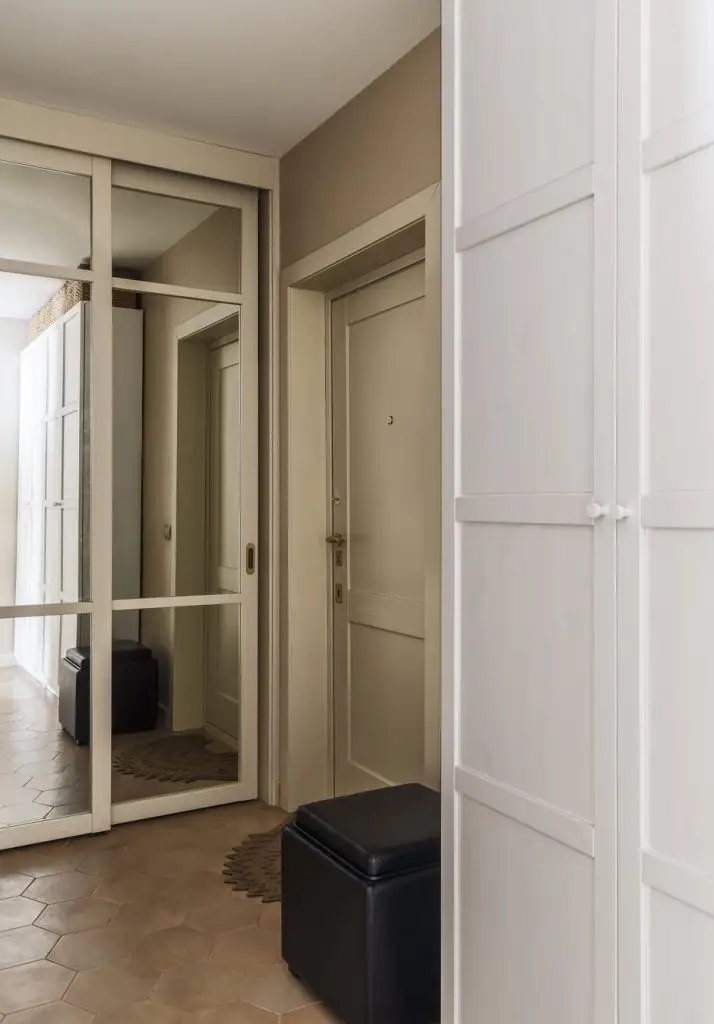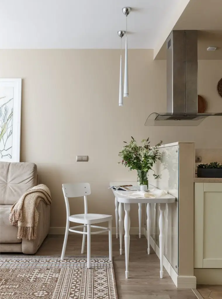 In urma acestor configurari, spatiul pare mai fluent, in ciuda reducerii suprafetei aferente fiecarei functiuni in parte. De aceea, designerul a mizat pe o nuanta neutra cu care a zugravit toti peretii, creand astfel o senzatie unitara la nivelul amenajarii.