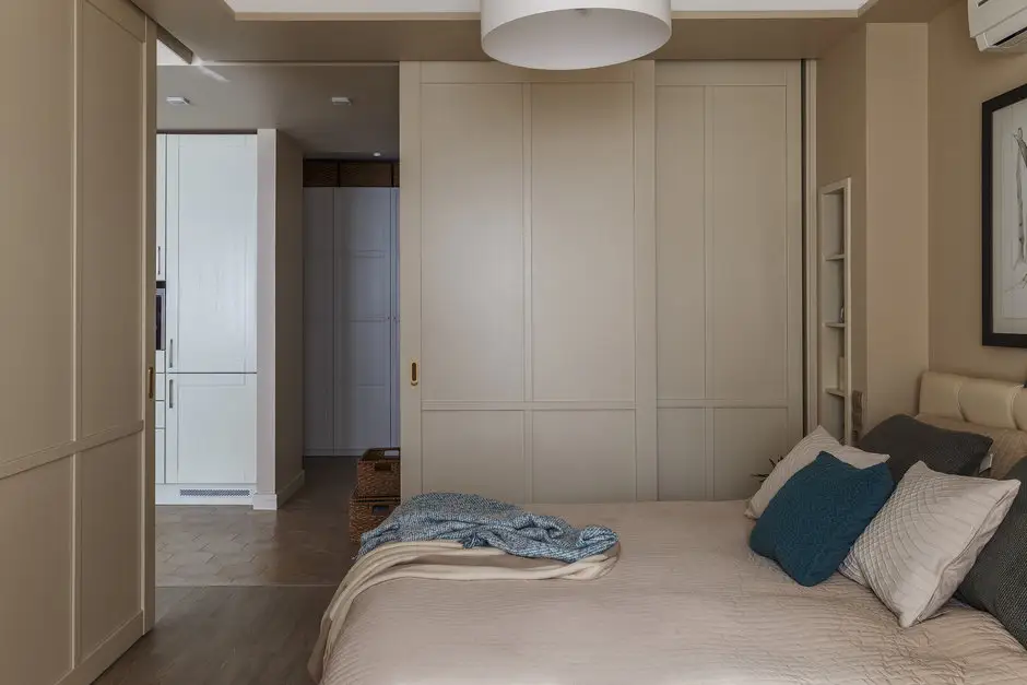Dormitorul preia tema cromatica dezvoltata in living. Odata ce usile se deschid, spatiul comunica direct cu restul casei. Designerul a gandit spatii de depozitare generoase, cu un dressing incorporat intr-o nisa si un dulap asezat in spatiul fostului balcon.