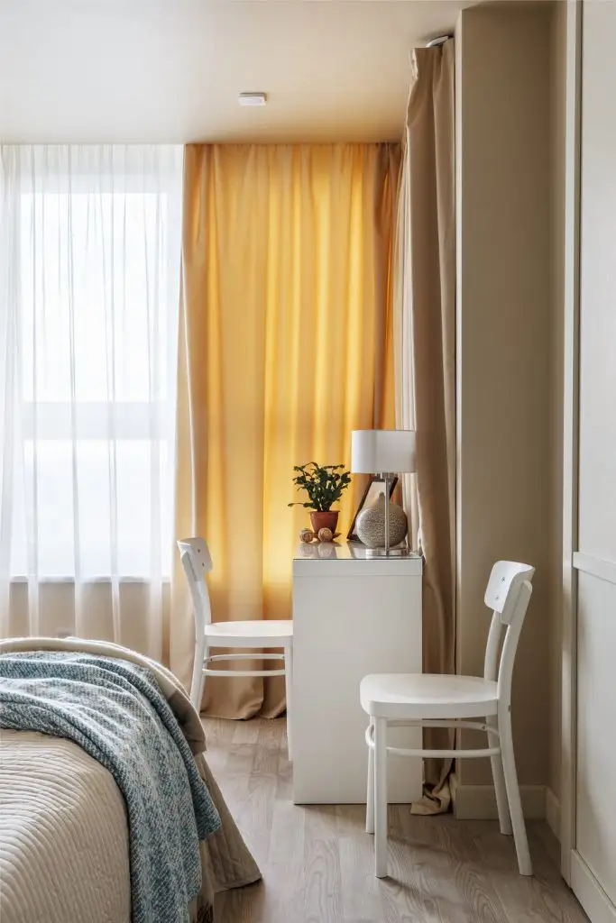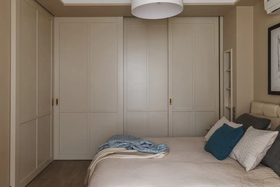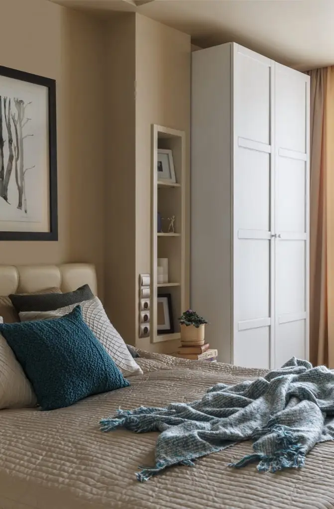 In aceeasi masura, cele doua corpuri cu rafturi de o parte si cealalta a patului sunt si ele incastrate intr-o nisa special creata; sunt mici, dar suficiente pentru cateva decoratiuni de bun-gust. Culorile se imbina armonios si descriu un spatiu calm, relaxant, confortabil, tihnit.