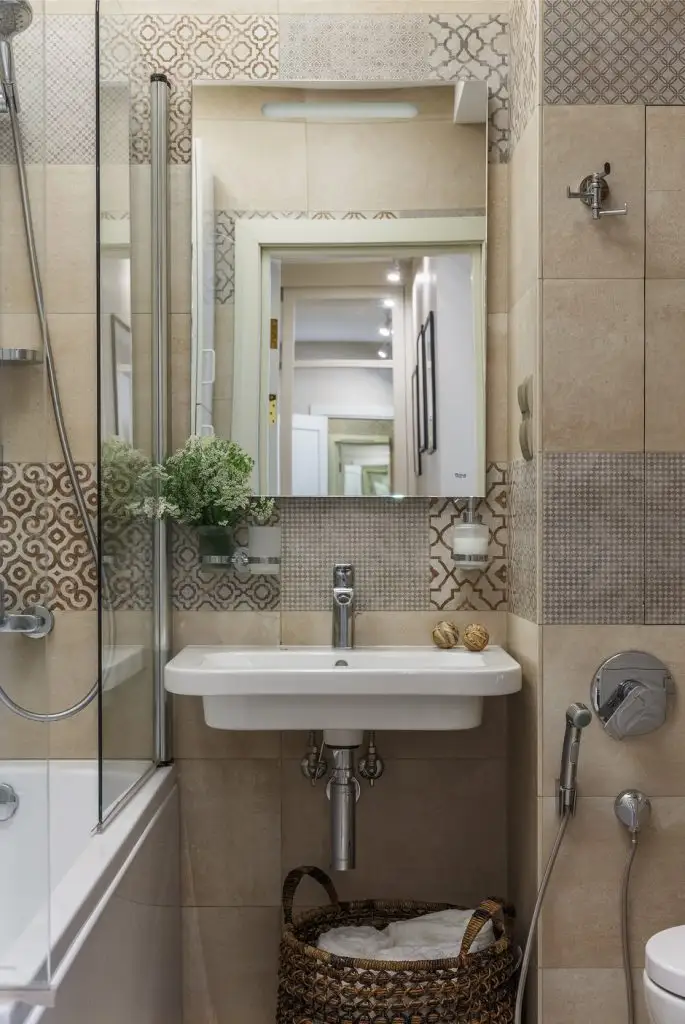 In baie, totul a fost excelent amenajat si s-a reusit incadrarea tuturor obiectelor necesare – cada, lavoar, toaleta, ba chiar si masina de spalat cu un uscator de rufe automat. Totul este adaptat dimensiunilor existente, iar placile ceramice in acelasi spirit cromatic cu ceea ce regasim in restul locuintei. Braurile de placi decorative imprima dinamica incaperii.