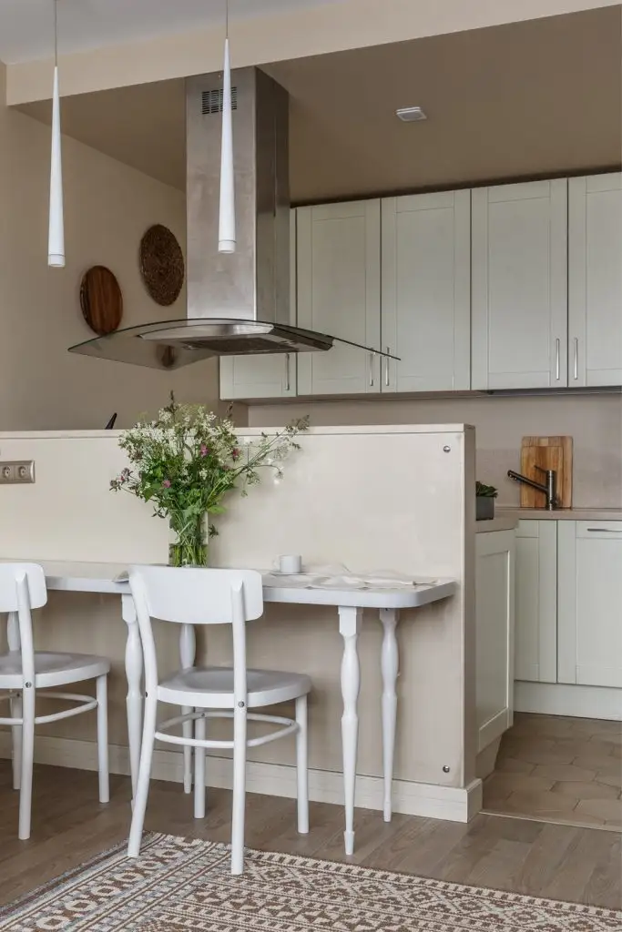 In cazul bucatariei, a fost creata o nisa in spatiul holului, ceea ce a permis integrarea mobilierului intr-o maniera compacta.