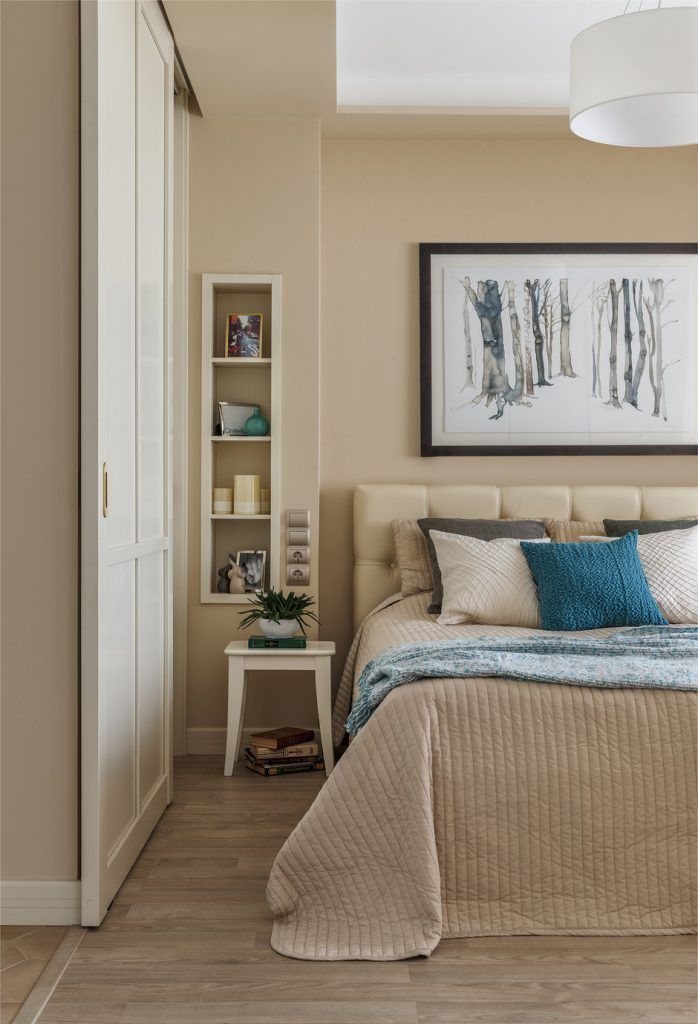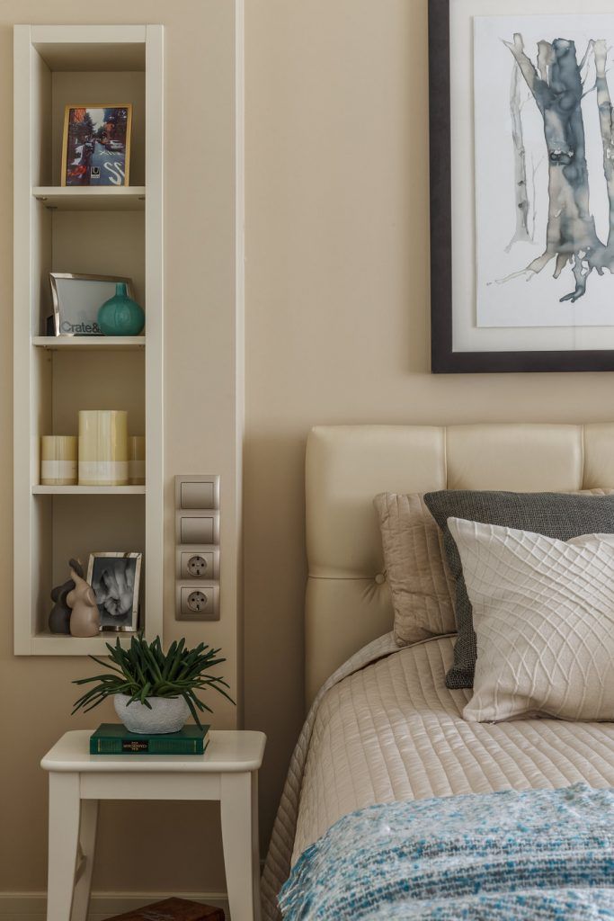 In aceeasi masura, cele doua corpuri cu rafturi de o parte si cealalta a patului sunt si ele incastrate intr-o nisa special creata; sunt mici, dar suficiente pentru cateva decoratiuni de bun-gust. Culorile se imbina armonios si descriu un spatiu calm, relaxant, confortabil, tihnit.