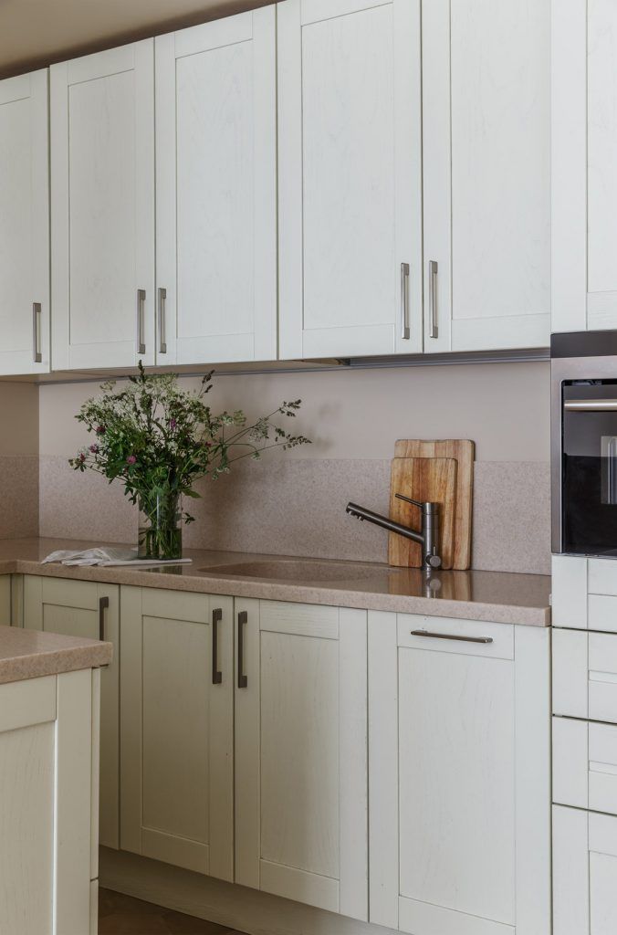 Frontul crem al dulapurilor imprima mai multa luminozitate acestei zone usor in umbra. Compenseaza si spoturile incastrate in tavan precum si cele 2 corpuri suspendate deasupra mesei de dining.