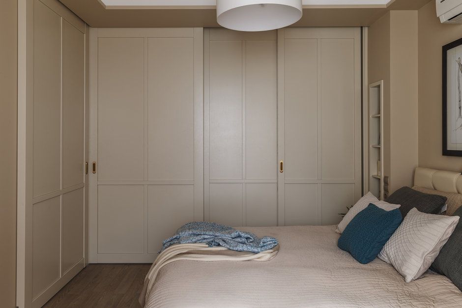 Dormitorul preia tema cromatica dezvoltata in living. Odata ce usile se deschid, spatiul comunica direct cu restul casei. Designerul a gandit spatii de depozitare generoase, cu un dressing incorporat intr-o nisa si un dulap asezat in spatiul fostului balcon.