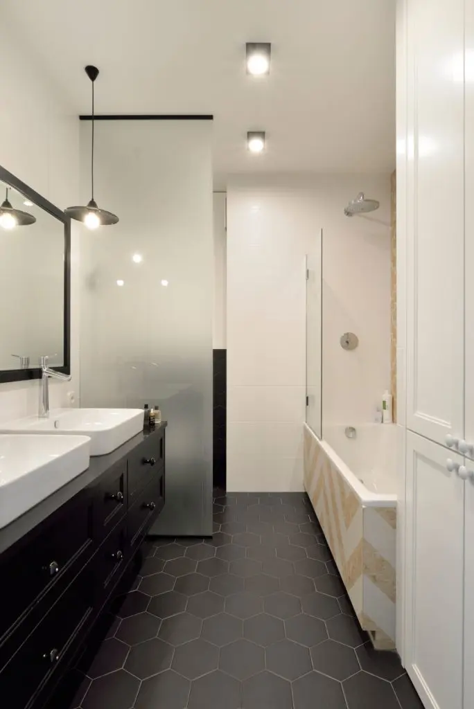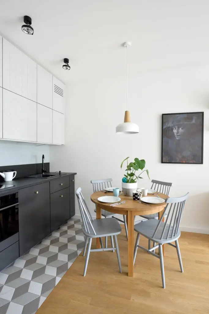 Pentru a asigura o utilizare optima, designerii au mizat pe o amenajare compacta, liniara, cu toate electrocasnicele incorporate. Dispunerea pe doua niveluri ale dulapurilor superioare asigura un plus de depozitare. Practic, spatiul a fost folosit pe verticala, maximizand perimetrul disponibil. Contrastul intre alb si gri inchis creeaza un plus de interes; la acest detaliu se adauga si portiunea de pardoseala placata cu placi decorative tridimensionale.