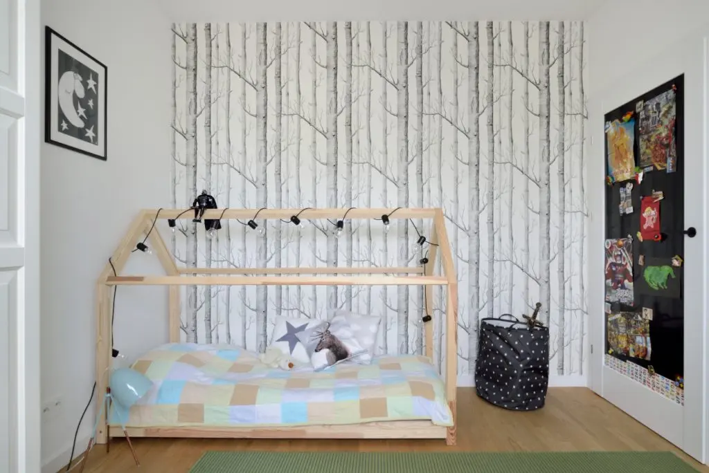 Dormitorul matrimonial este destul de minimal redat, tinand cont de faptul ca inainte de reconversie, aici, se afla bucataria. Si pentru celelalte doua dormitoare s-a urmarit aceeasi linie minimalista, cu modele de tapet care contureaza zone de accent si piese cu design jucaus potrivite pentru camere de copii.