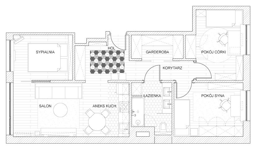 Deschide Galeria Locuinta despre care vorbim are 75 metri patrati si se afla in Polonia. Pentru a duce la bun sfarsit acest proiect de reamenajare, beneficiarii au apelat la ajutorul designerilor de la Boho Studio, care i-au ghidat si sfatuit in privinta detaliilor tehnice referitoare la recompartimentari si redistribuire a spatiului de locuit. Practic, toate functiunile din apartament au suferit modificari, cea mai semnificativa fiind mutarea bucatariei in spatiul livingului. Apoi, baia a fost largita pentru a o face accesibila tuturor, iar usile de acces in cele doua dormitoare ale copiilor modificate si ele in urma schimbarilor din baie.