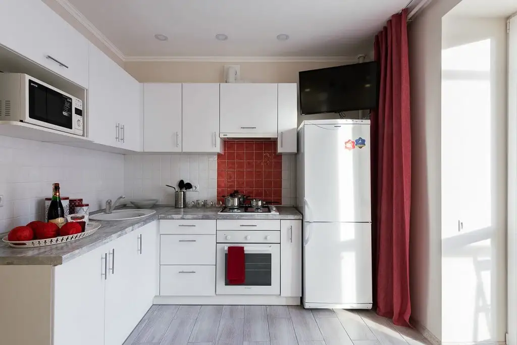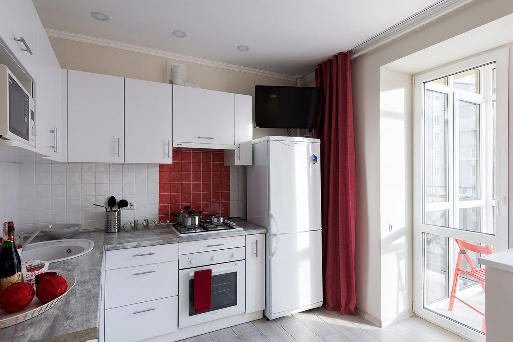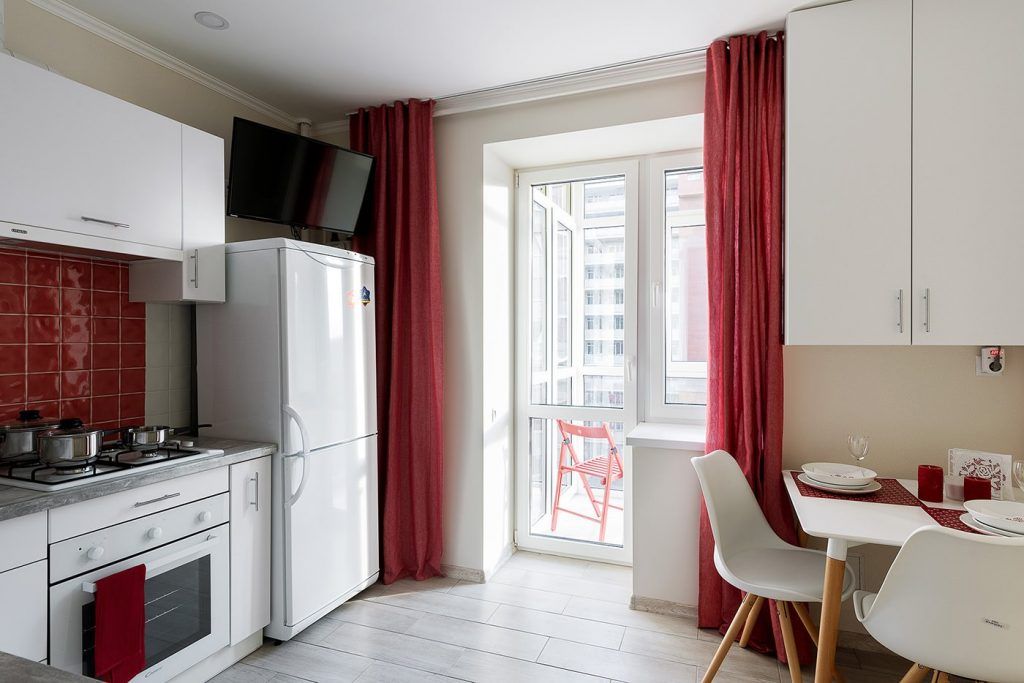 Si pentru ca motivul amenajarii este rosul, iata o idee ce aduce un plus decorului bucatariei: flisele din dreptul plitei sunt vopsite cu rosu. In dreptul ferestrei s-a conturat un loc de luat masa, mic, discret, dar placut in contextul spatiului mic al camerei.
