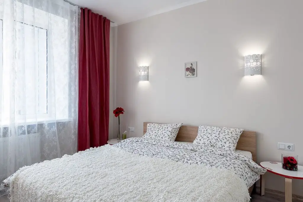 Linia simpla se pastreaza si in amenajarea dormitorului. Nuante calde de crem si bej cu mici accente de rosu contureaza spatiul incaperii destinate somnului si relaxarii. Cele 2 masute pe post de noptiere, aplicele cu design traforat, perdelele si draperiile descriu o amenajare care te poate inspira pentru propriul dormitor.