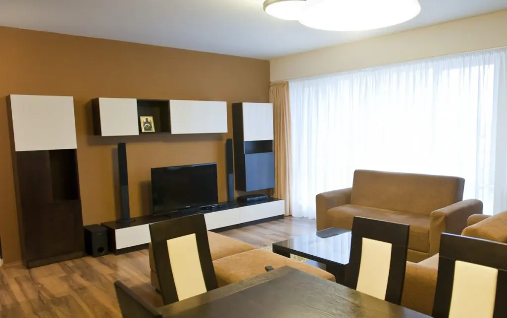 Confortul si estetica mobilierului este data de materialul din care este alcatuit: M DF furnuit si M DF vopsit. Cu exceptia scaunelor, tot mobilierul a fost facut la comanda pentru a se potrivi dimensiunilor incaperii.
