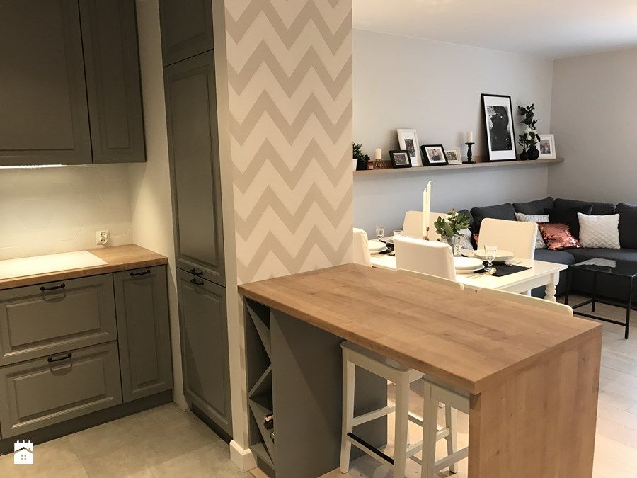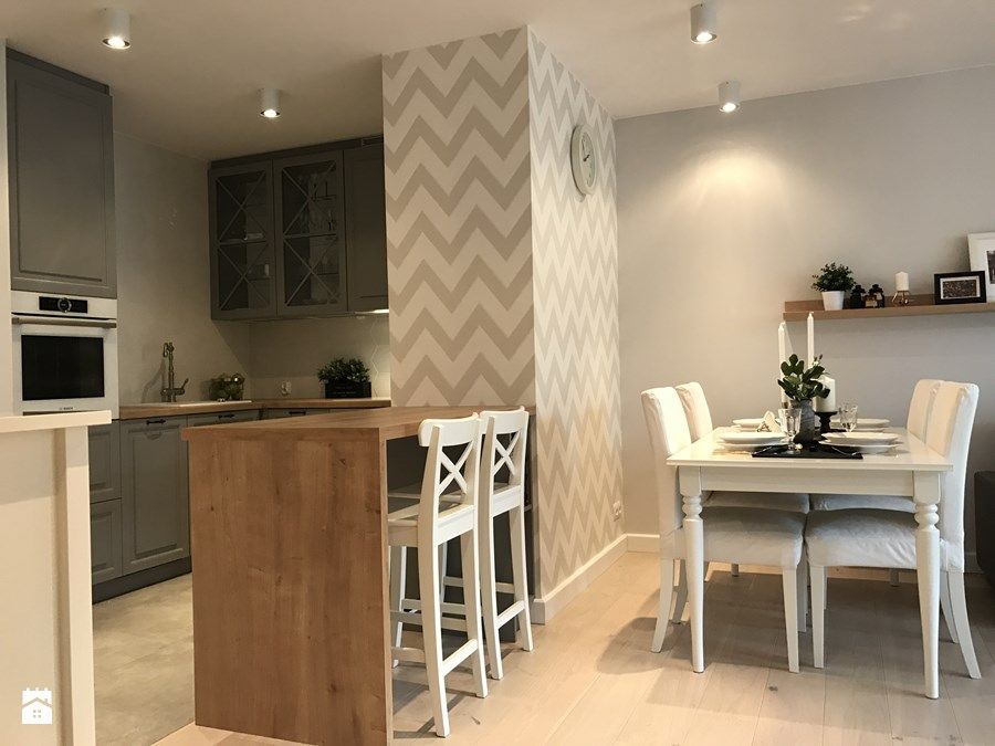 Motivul zigzagului se repeta in amenajare atat in living cat si in zona bucatariei si chiar a dormitorului. Este o metoda simpla de a distrage atentia de la dimensiunile spatiului si in acelasi timp de a crea coerenta la nivelul amenajarii. In cazul acestui apartament, efectul este unul dinamic, iar imprimeul nu perturba decorul, fiind folosit un bej placut.