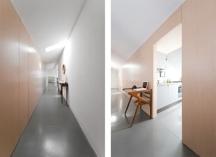 Principalele cerinte ale tinerilor proprietai ai aceste mansarde a fost crearea unui spatiu dinamic care sa cuprinda un dormitor, o baie si o bucatarie, precum si a unor multiple spatii de depozitare.