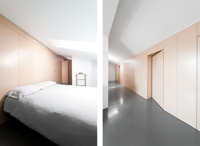 Principalele cerinte ale tinerilor proprietai ai aceste mansarde a fost crearea unui spatiu dinamic care sa cuprinda un dormitor, o baie si o bucatarie, precum si a unor multiple spatii de depozitare.