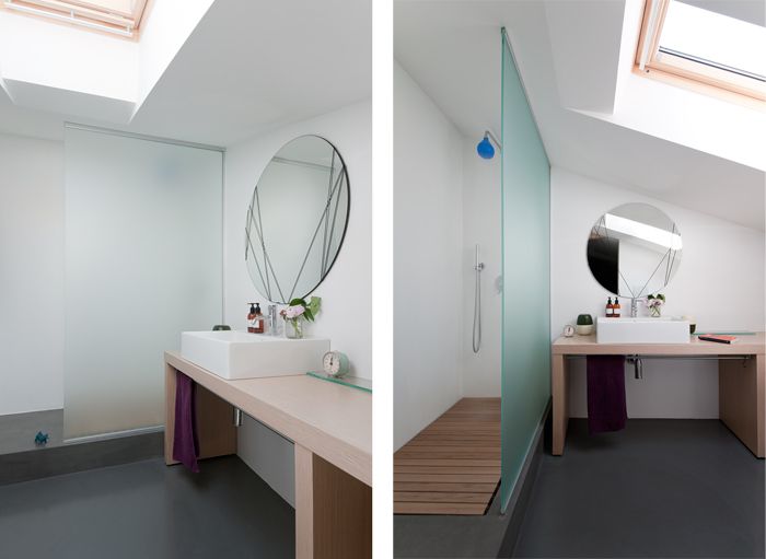Gestionarea cu inteligenta a acestor spatii a reusit sa puna in evidenta toate avantajele geometrice pe care cladirea le avea: plafonul inclinat, peretele despartiror si ferestrele tip luminator. Cei de la Studio W OK se adapteaza foarte bine cerintelor clientilor, iar rezultatele muncii lor sunt uimitoare. Acestia reusesc sa redefinineasca si sa reintegreze spatii anoste in alte registre, punandu-si amprenta proprie de fiecare data. Se pare ca au o predilectie pentru folosirea lemnului pe un fundal alb. Aceste doua elemente creeaza o oarecare spatialitate din punct de vedere vizual, iar impreuna cu geometira atipica a mansardei spatiul devine unul autentic care il face sa se diferentieze de o locuinta normala.