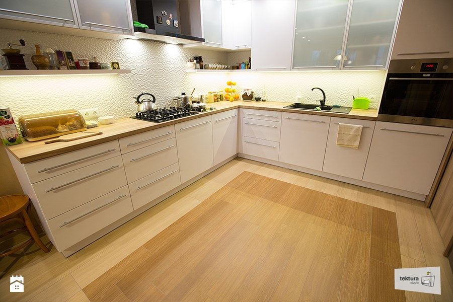 De remarcat jocul parchetului: in mijlocul bucatariei s-a folosit o nuanta mai inchisa a placilor, un mod subtil de a inlocui un covor si de a face trecerea spre dining.