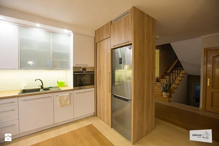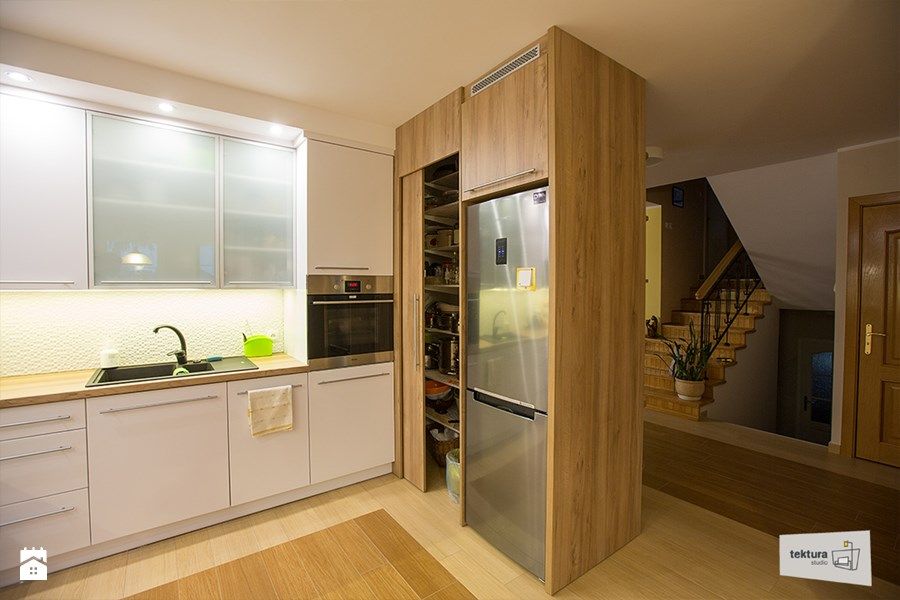 In plus, acest aranjament a permis integrarea unui numar mai mare de spatii de depozitare, cum ar fi acea mini-camara de langa frigider. Practic, este un corp in care au fost incorporate eficient aceste doua zone de stocare, acelasi corp avand si rolul de delimitare a bucatariei.