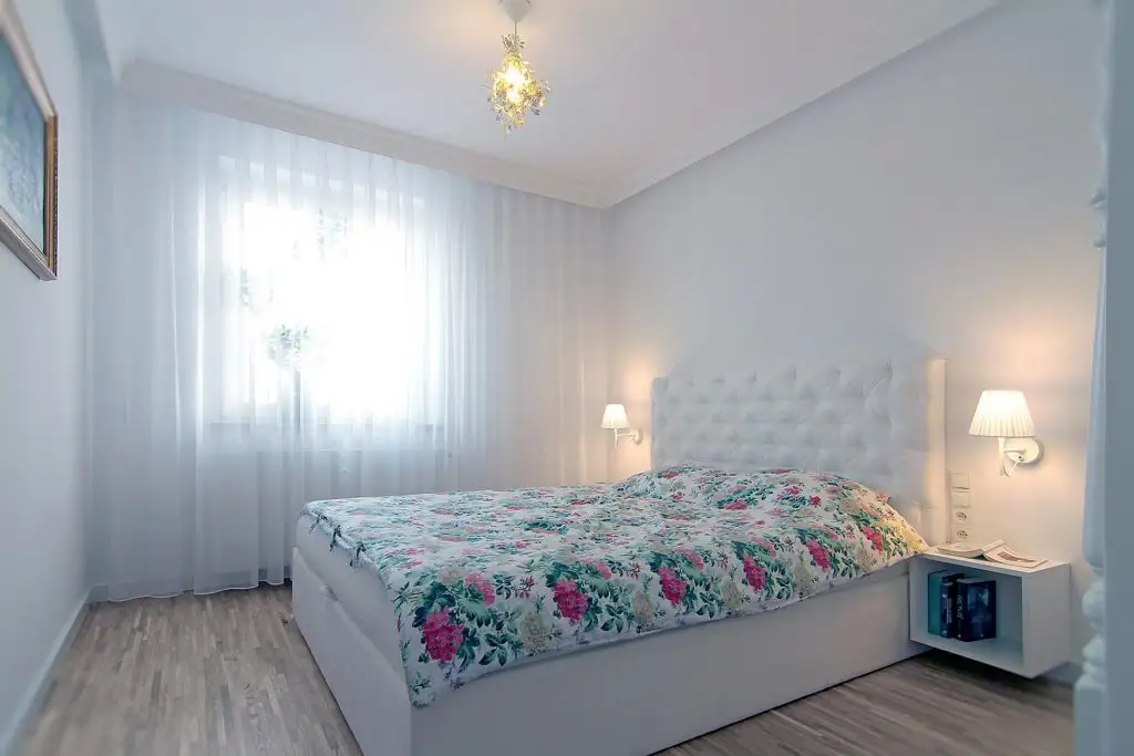 Dormitorul arata foarte confortabil si el, alb peste tot, perdele care filtreaza placut lumina, un corp de iluminat discret, un pat cu tablie tapitata, si noptiera ingenioasa pentru depozitare.