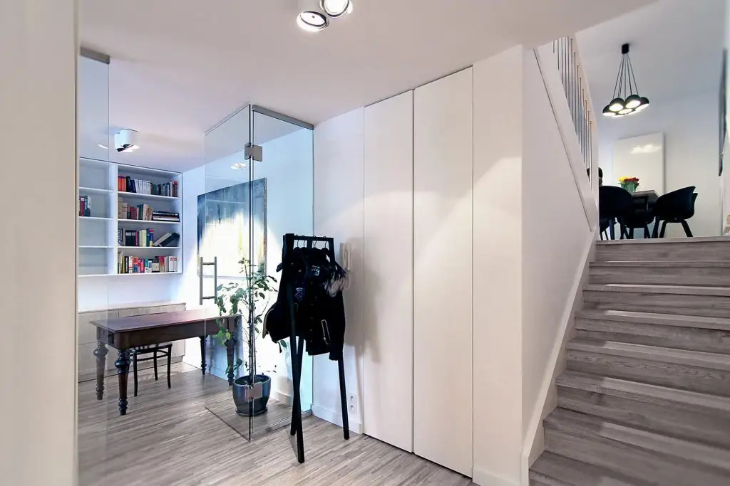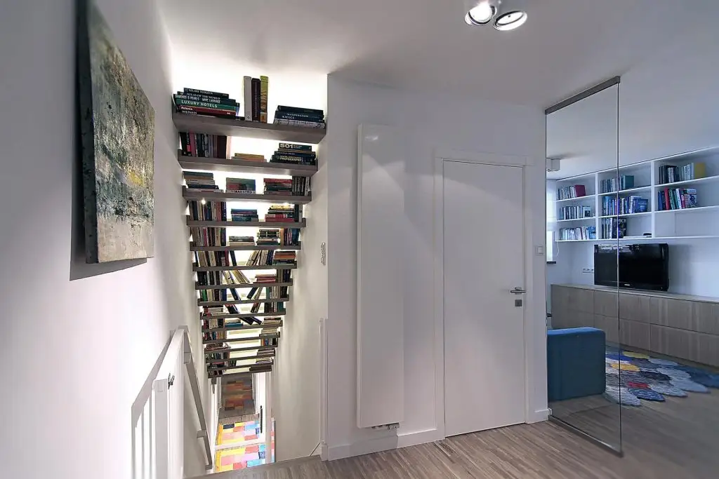 Casa scarii are inclusa un spatiu de depozitare unde sunt asezate cartile. O idee foarte ingenioasa pentru o buna optimizare a spatiului de locuit. Este de remarcat ca majoritatea usilor sunt de sticla, pentru a facilita patrunderea luminii in interiorul camerelor.
