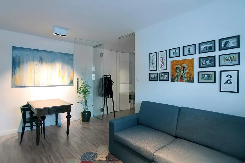 Unul din punctele centrale ale amenajarii este reprezentat de living. Acesta este un loc confortabil si creativ. Desi peretii sunt albi acestia pun foarte bine in valoare elementele de decor: tablouri, ilustratii, o planta care ofera o oaza de verdeata, iar langa canapea, covorul completeaza decorul in mod placut.