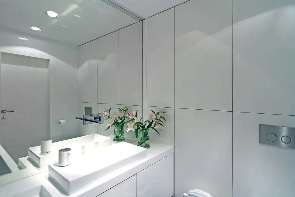 A doua baie se diferentiaza prin textura peretilor. Aici au fost instalate placi ceramice de mari dimensiuni, iar peretele din dreptul chiuvetei a fost acoperit in intregime cu o oglinda. Si aici au fost integrate plantele, accente de culoare binevenite in marea de alb a acestei camere.