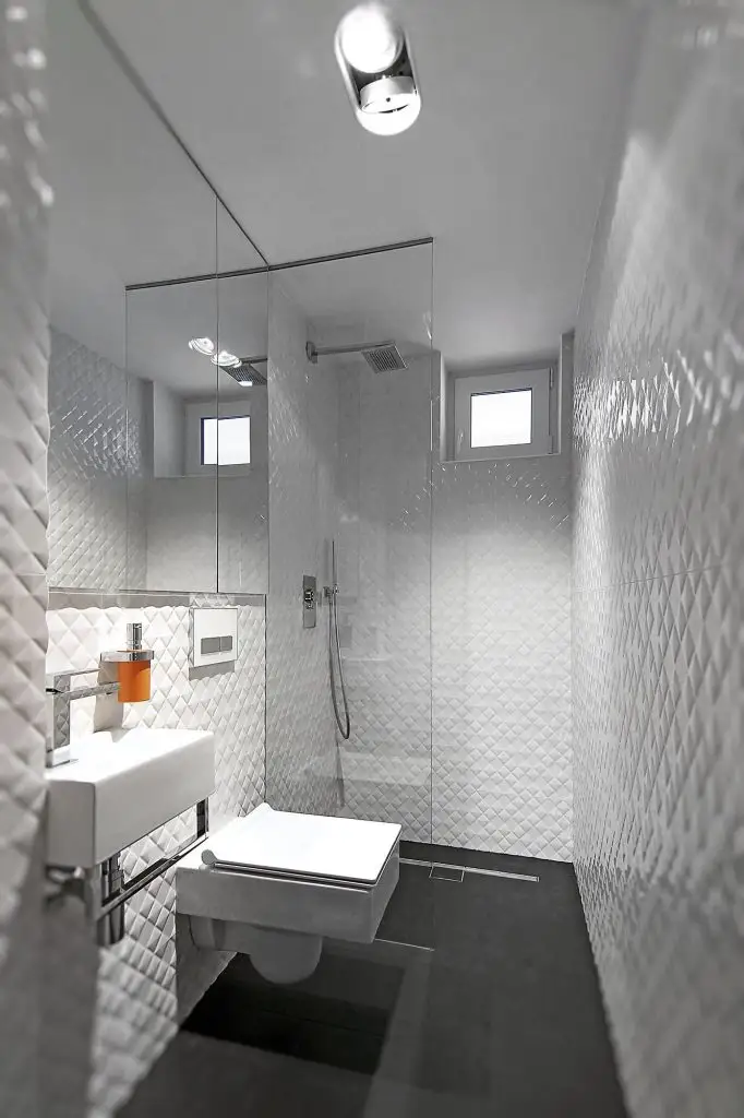 Una din bai se evidentiaza prin faianta cu o textura interesanta. Peretii sunt si ei albi, ca in restul casei, iar podeaua de culoare gri inchis delimiteaza foarte bine spatiul. Si aici liniile sunt clare, iar contrastul placilor ceramice contureaza un ambient modern.