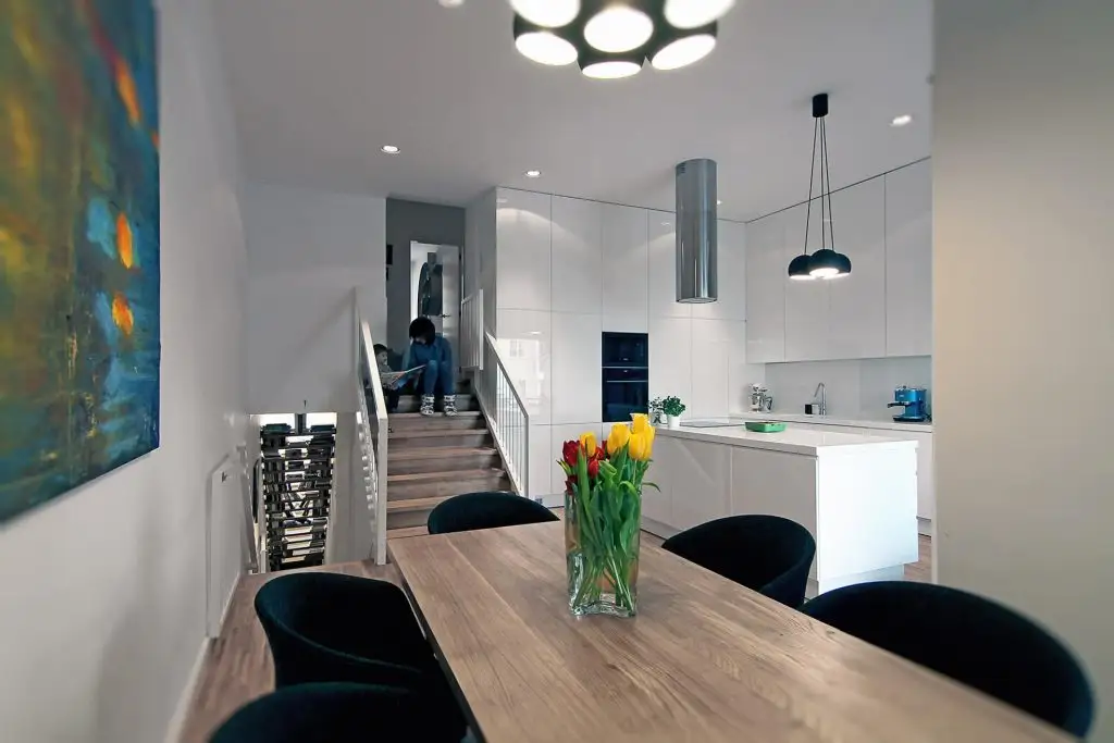 Bucataria dispune si de un mic balcon in dreptul caruia vom gasi un fotoliu confortabil cu o culoare vibranta. Sistemul de iluminat, sub forma unui "buchet de lumini", ofera personalitate acestui nivel.