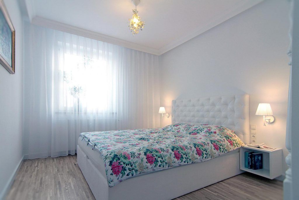Dormitorul arata foarte confortabil si el, alb peste tot, perdele care filtreaza placut lumina, un corp de iluminat discret, un pat cu tablie tapitata, si noptiera ingenioasa pentru depozitare.