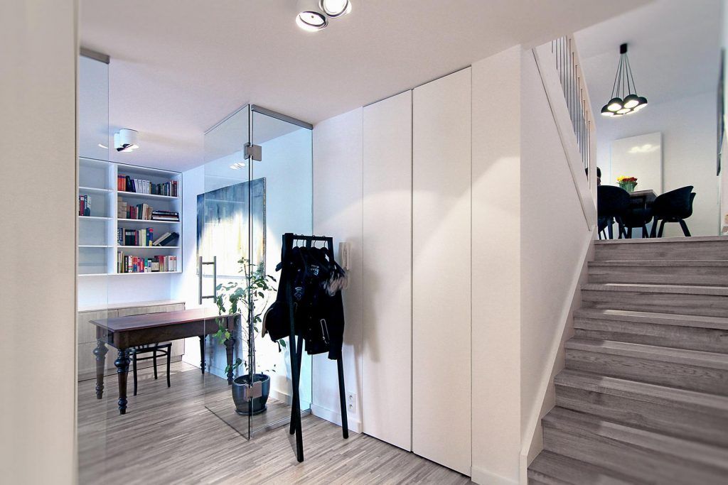 Casa scarii are inclusa un spatiu de depozitare unde sunt asezate cartile. O idee foarte ingenioasa pentru o buna optimizare a spatiului de locuit. Este de remarcat ca majoritatea usilor sunt de sticla, pentru a facilita patrunderea luminii in interiorul camerelor.
