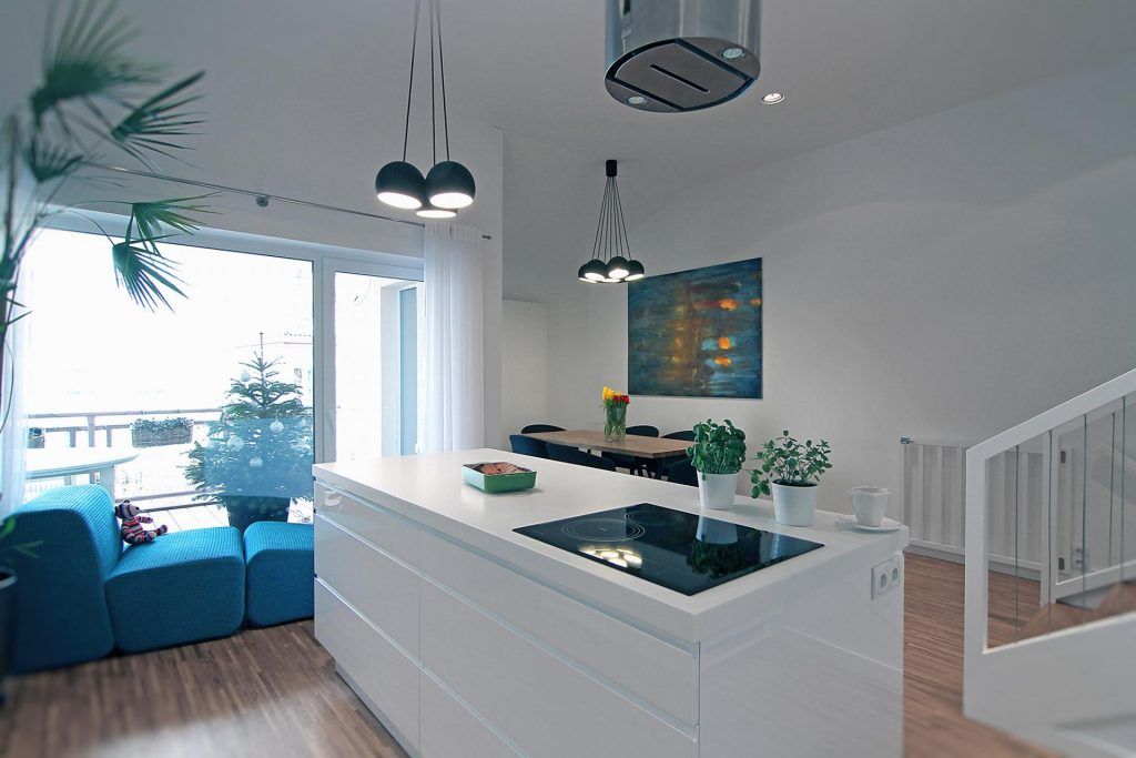 Bucataria dispune si de un mic balcon in dreptul caruia vom gasi un fotoliu confortabil cu o culoare vibranta. Sistemul de iluminat, sub forma unui "buchet de lumini", ofera personalitate acestui nivel.
