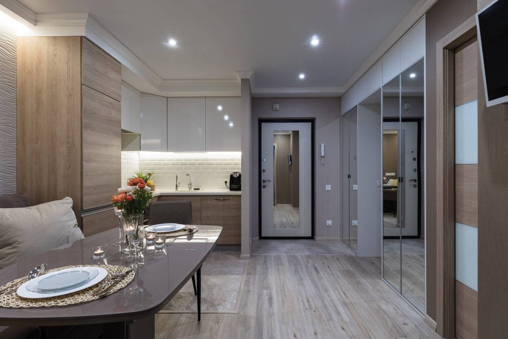 Familia nu si-a dorit nimic complicat, ci doar o amenajare moderna, functionala, care sa fie pe masura nevoilor lor. Astfel, in hol, designerul a creat o zona de depozitare cu dulapuri, paralel dispuse de o parte si cealalta a usii de la prima incapere. Fatetele cu oglinzi sporesc senzatia de marire a spatiului, un truc eficient pentru orice spatiu mic. Surprinzator este faptul ca au montat o oglinda chiar si pe usa de la intrare.