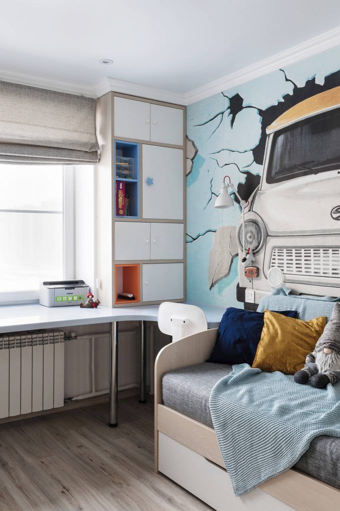 Camera copilului aduce un plus de culoare printr-o idee similara a unui perete-accent de impact. Simetria dulapurilor o vom gasi si aici, de data asta de o parte si cealalta a ferestrei, unite de un birou.
