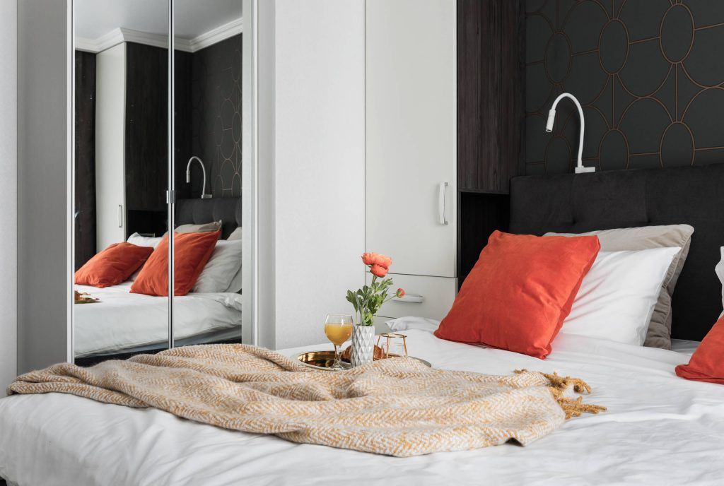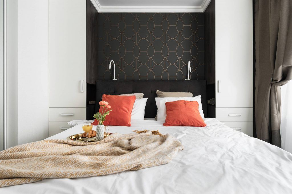 Nevoia de depozitare a fost prioritara in dormitorul parintilor. De aceea, doua dulapuri au fost asezate simetric, de o parte si cealalta a patului. Tapetul ales pentru a contura o zona-accent deasupra patului aduce o nota dramatica decorului.