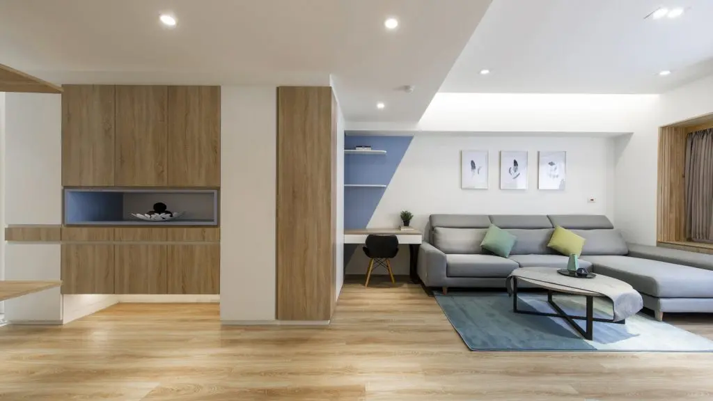 Trecerea dinspre holul de la intrare spre living se face discret cu ajutorul unor rafturi si dulapuri incastrate; tot in spatiul livingului a fost amenajat si o mica zona de lucru.