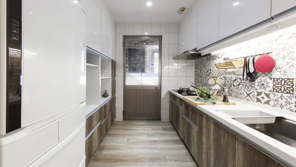 In bucatarie, transformarea notabila s-a produs la nivelul mobilierului si a braului dintre corpuri. Dulapurile nu au fost inlocuite, doar fronturile au fost schimbate cu un finisaj de lemn, iar panoul de sticla inlocuit cu placi ceramice decorative.