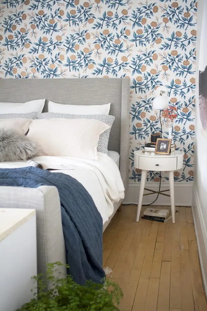 Peretele accent – un must have pentru o camera cu personalitate. Si da, acesta poate fi compus si intr-un spatiu mic. Pentru dormitorul nostru s-a optat pentru un tapet cu motiv floral montat doar pe peretele cu patul, in zona de inclinare a tavanului. Astfel, spatiul ramane luminos si neincarcat vizual.