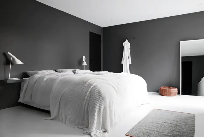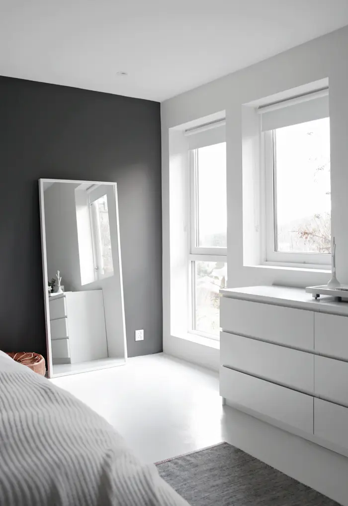 Interesant este felul in care au fost dispuse culorile: tavanul alb, peretii gri si podeaua alba. Este o combinatie mai mult decat interesanta care transforma tiparul clasic de amenajare pentru dormitor. O oglinda cu rama alba este asezata langa fereastra intr-un mod intentionat, pentru ca reflecta astfel o parte din lumina naturala care inunda camera. Efectul este deosebit; desi nuanta de gri inchide camera, albul tavanului si podelei precum si lumina reconfigureaza cumva spatiul, facandu-l mai spatios si mai placut vizual.