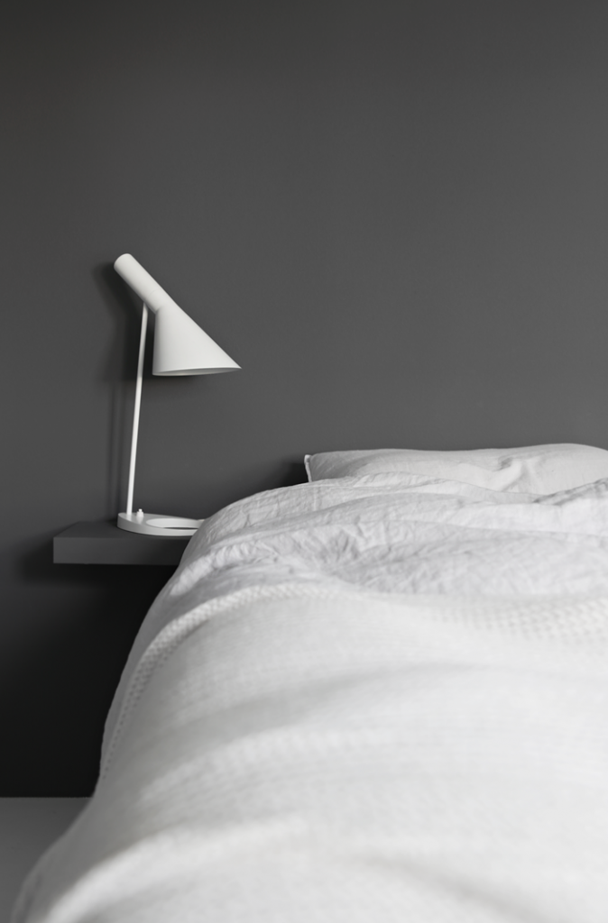 Interesant este felul in care au fost dispuse culorile: tavanul alb, peretii gri si podeaua alba. Este o combinatie mai mult decat interesanta care transforma tiparul clasic de amenajare pentru dormitor. O oglinda cu rama alba este asezata langa fereastra intr-un mod intentionat, pentru ca reflecta astfel o parte din lumina naturala care inunda camera. Efectul este deosebit; desi nuanta de gri inchide camera, albul tavanului si podelei precum si lumina reconfigureaza cumva spatiul, facandu-l mai spatios si mai placut vizual.