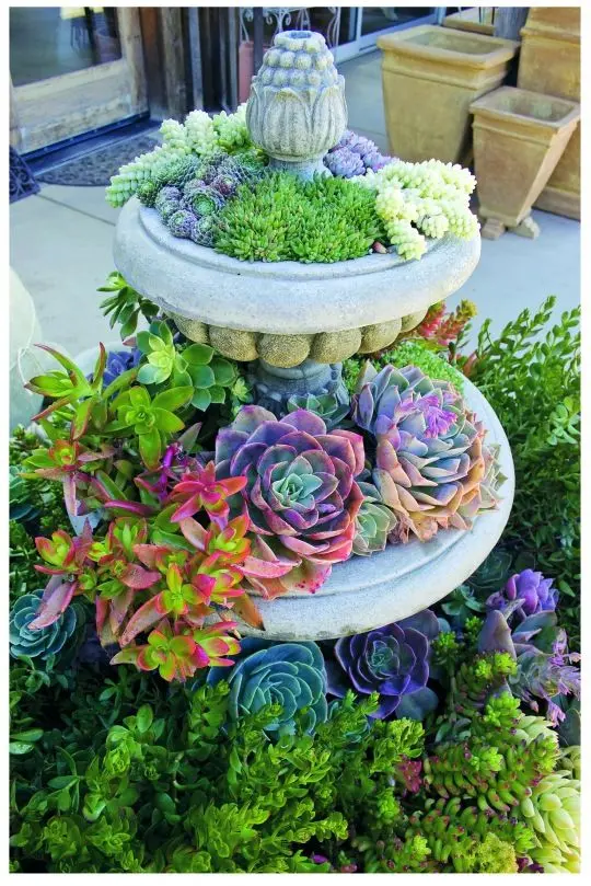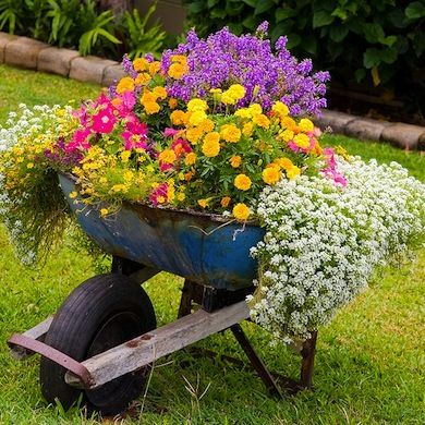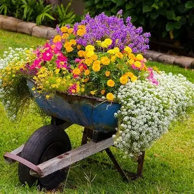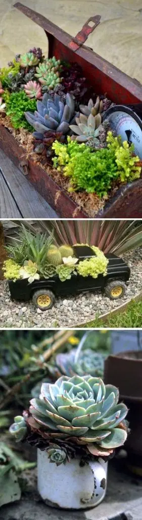 Daca in gradina dumneavoastra exista o fantana arteziana invechita, pastrati-o si umpleti-o cu flori si plante suculente – un terrarium chiar in mijlocul gradinii este o idee inedita, chiar eleganta. La fel puteti folosi si o roaba pe post de recipient pentru a sadi plante decorative. Si obiectele din bucatarie va pot ajuta sa creati recipiente creative pentru gradina.