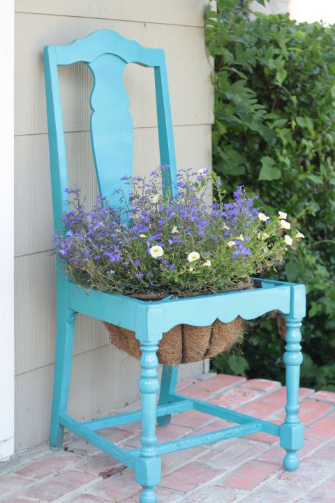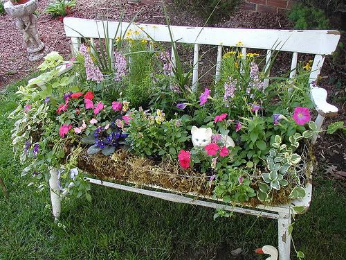 Un cufar vechi al bunicii, o valiza, un scaun shabby chic, toate pot fi integrate in decorul gradinii si amenajate astfel incat plantele sa locuiasca fericite in noile lor recipiente.