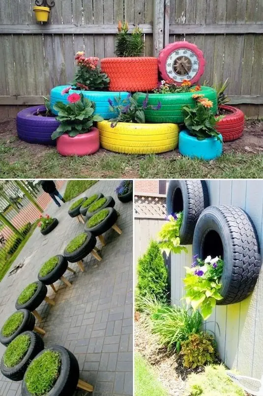 Cunoasteti vecini sau poate aveti chiar dumneavoastra cauciucuri vechi prin garaj? Oferiti-le o noua utilizare, transformandu-le in recipiente creative pentru flori. Daca marimile lor variaza, e si mai bine. Varietatea este binevenita. Vopsiti-le in culori diferite pentru ca aspectul gradinii sa fie vesel si placut.