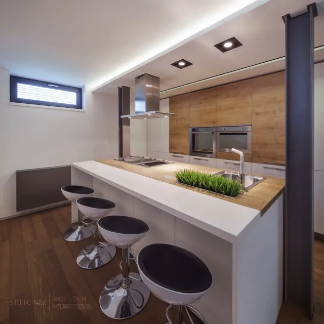 Bucataria de tip open-space, amenajata intr-un stil foarte modern.