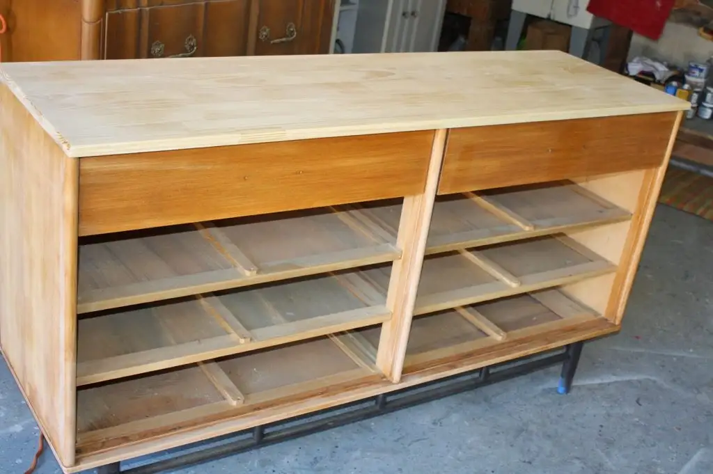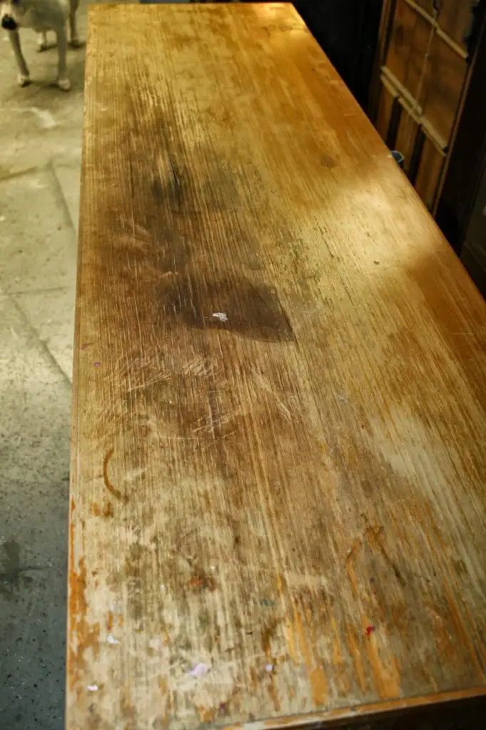 “Din cauza uzurii foarte avansate a trebuit sa inlocuiesc complet blatul dulapului, deoarece era iremediabil. Am folosit o piesa din lemn masic de pin si am netzit marginile.