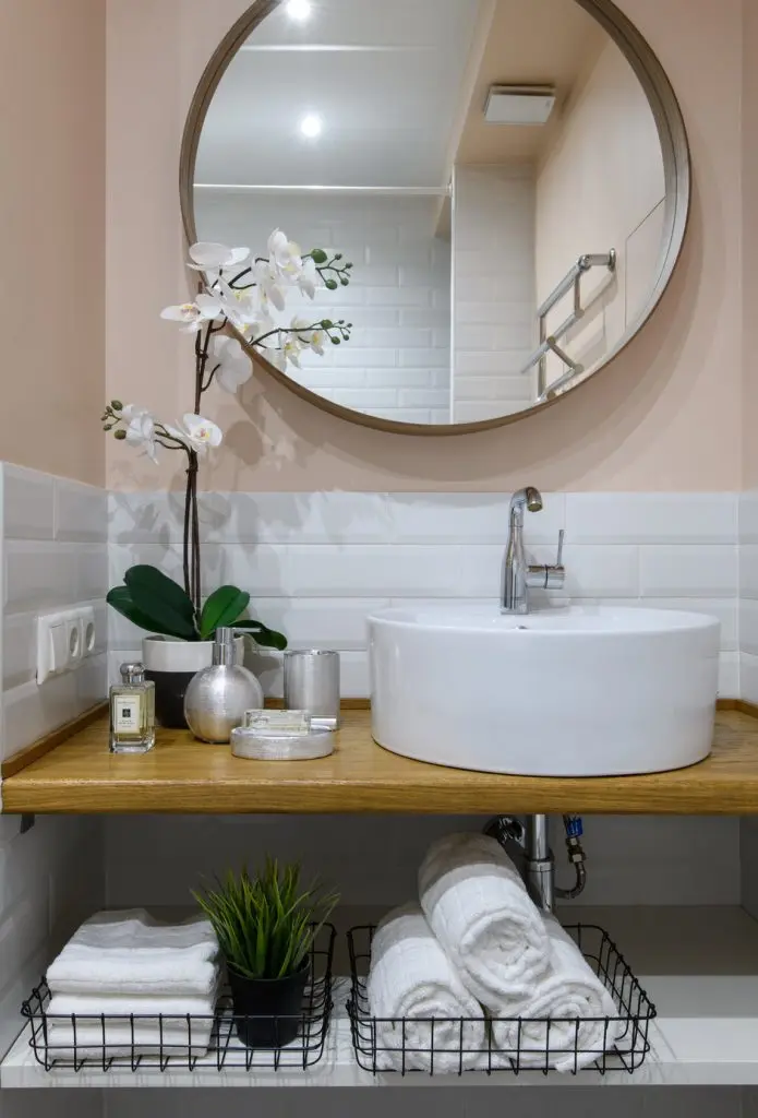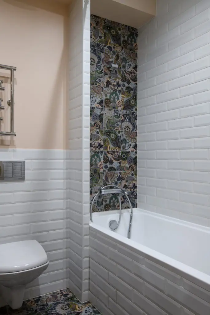 Pentru baie s-a mers pe aceeasi linie a optimizarii, oferind cele necesare unui astfel de spatiu, incluzand si masina de spalat rufe. S-au folosit placi ceramice albe tip metro pentru zonele de stropire, iar restul spatiului zugravit cu vopsea speciala pentru spatii umede; la nivelul pardoselii, din nou placi decorative viu colorate.